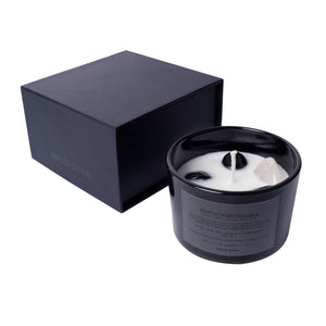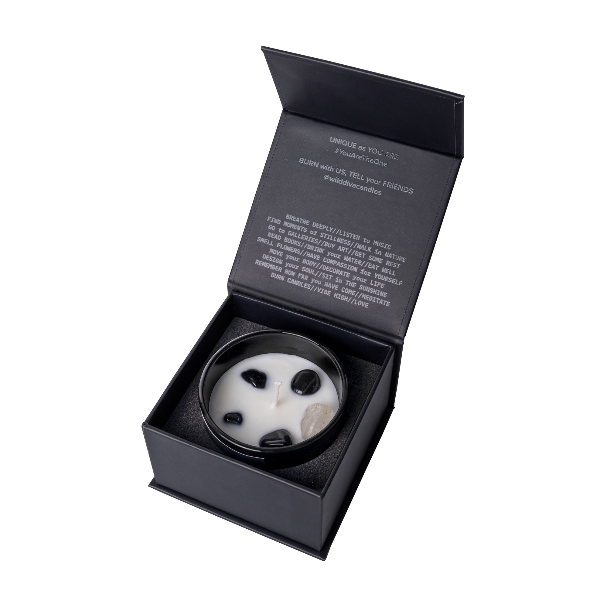 Introducing our new Wild Diva Candle, a lavish blend of inspiration and indulgence. Crafted in a sleek, black circular base and adorned with clear quartz and black obsidian crystals, this candle is designed to channel your inner power while offering a moment of serene tranquility.